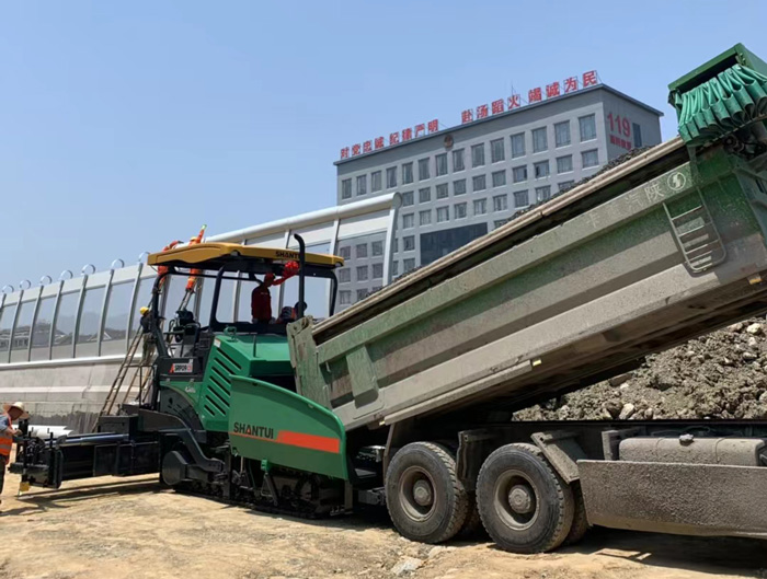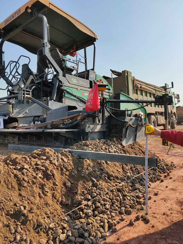 “快速路上有很多匝道和路口,井口更是多不胜数,做这个的摊铺机必须能伸缩,转弯处还能进行大厚度摊铺,最重要是摊铺速度要快。一车料45吨,一小时来8车料,所以摊铺机必须4分钟之内完成45吨水稳料的输料,分料,振捣,不然料车和拌和料场就要停工等待。”吴总买车前,聊起对新摊铺机的基本要求。