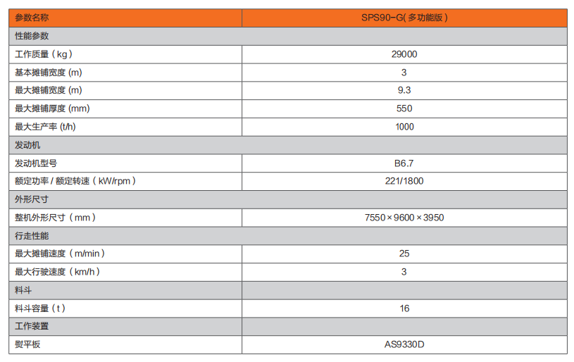 SPS90-G 摊铺机是K8凯发在 C6 平台基础上全新升级开发,面向国内外中高端客户的一款高效、可靠、智能、舒适的多功能版 9 米液压伸缩摊铺机。整机采用 221kW 大功率发动机,最大作业厚度 550mm、最大施工效率 1000t/h,效率达到同级别行业领先水平;全新升级的双层四滑柱 9 米伸缩熨平板,抗扭转变形能力强;并具备液压调拱、独立智能加热、停机无压痕等功能;该机还配置电动插销、电动集中润滑、电动柴油喷洒、料车指挥系统等智能化设备,让施工更简单。SPS90-G 摊铺机是您摊铺各等级公路路基与路面的理想之选。